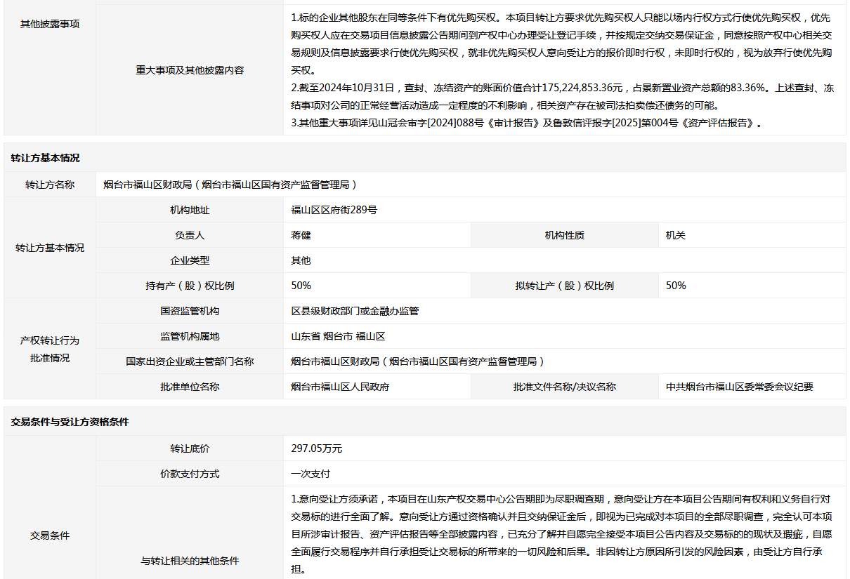 轉(zhuǎn)讓方: 煙臺市福山區(qū)財政局(煙臺市福山區(qū)國有資產(chǎn)監(jiān)督管理局)