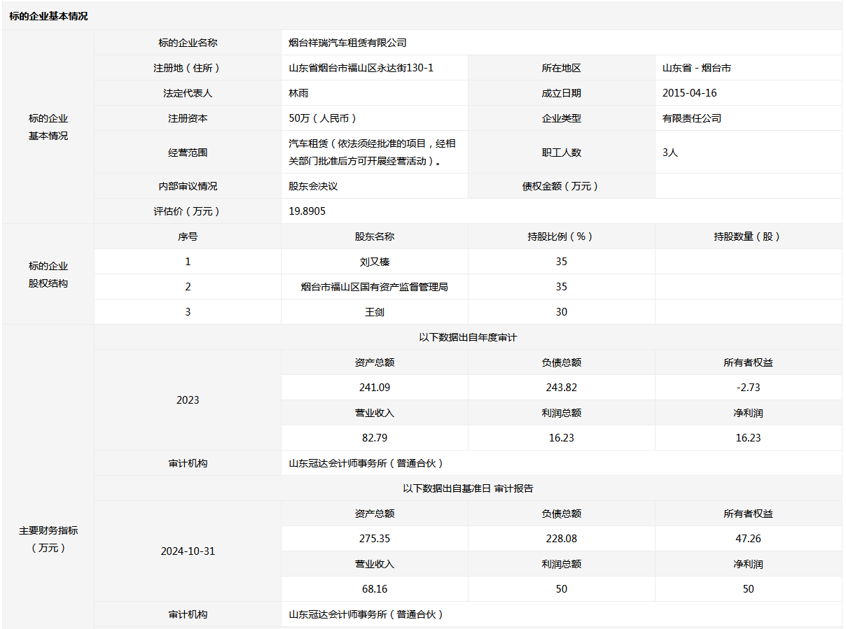 煙臺祥瑞汽車租賃有限公司35%國有股權