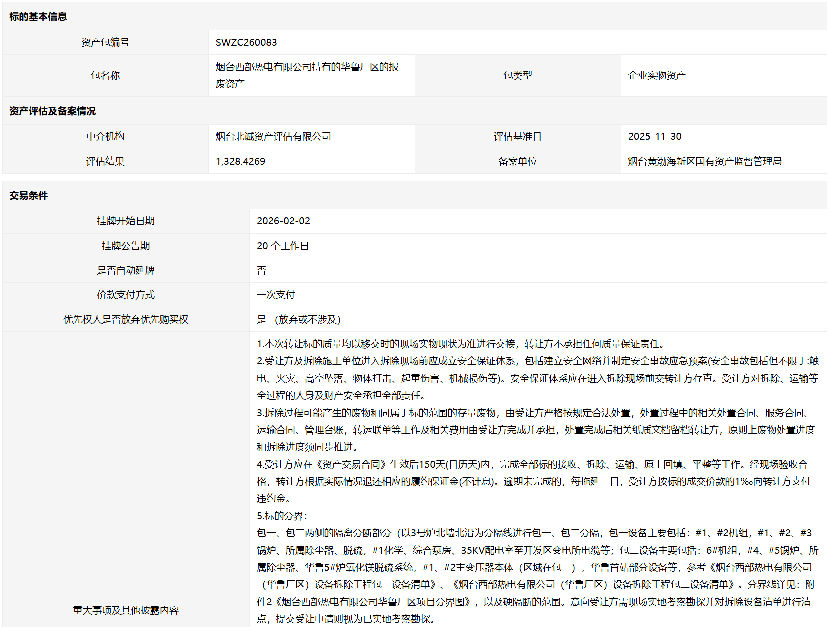 煙臺西部熱電有限公司持有的華魯廠區(qū)的報廢資產
