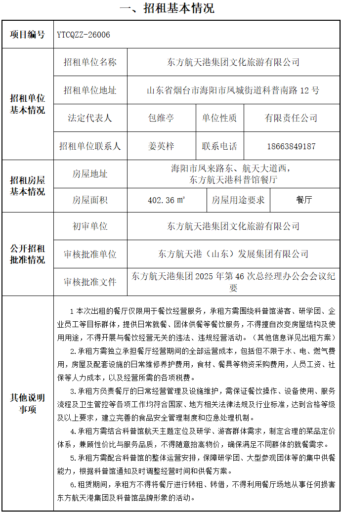 東方航天港科普館餐廳租賃運(yùn)營服務(wù)項(xiàng)目