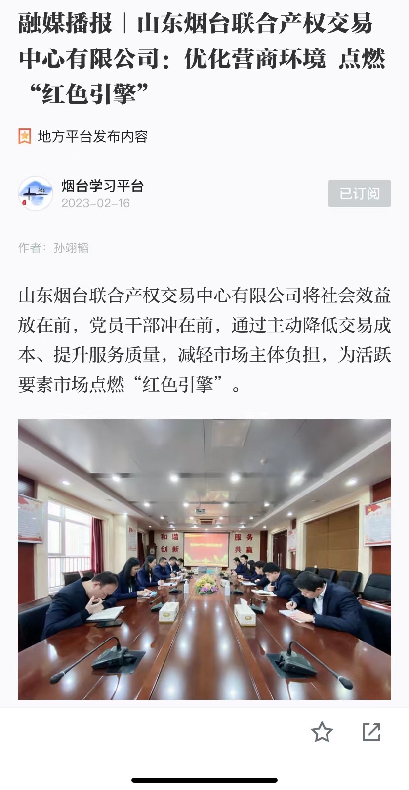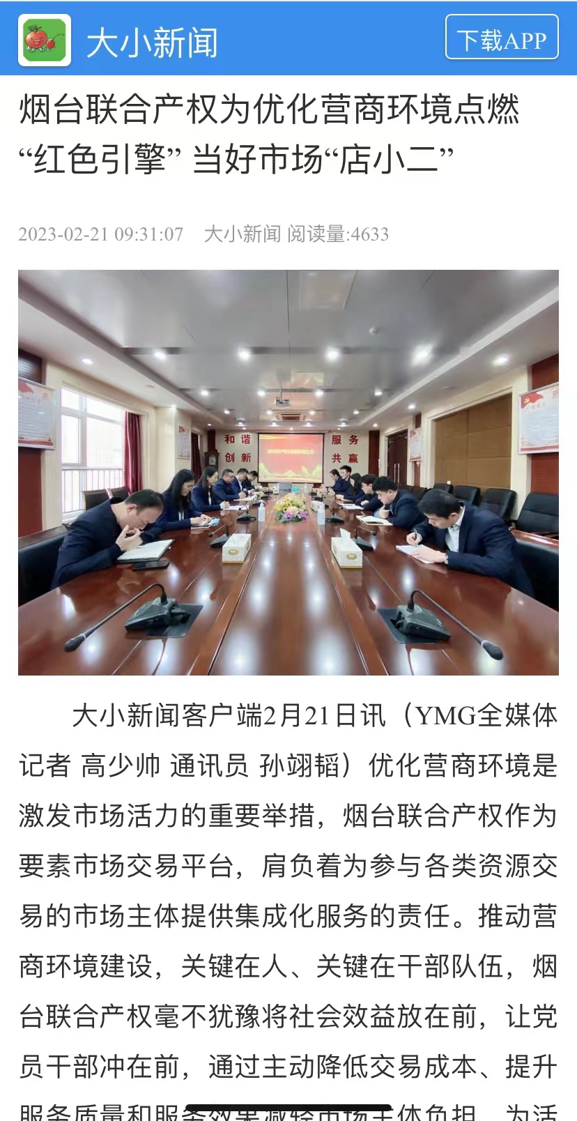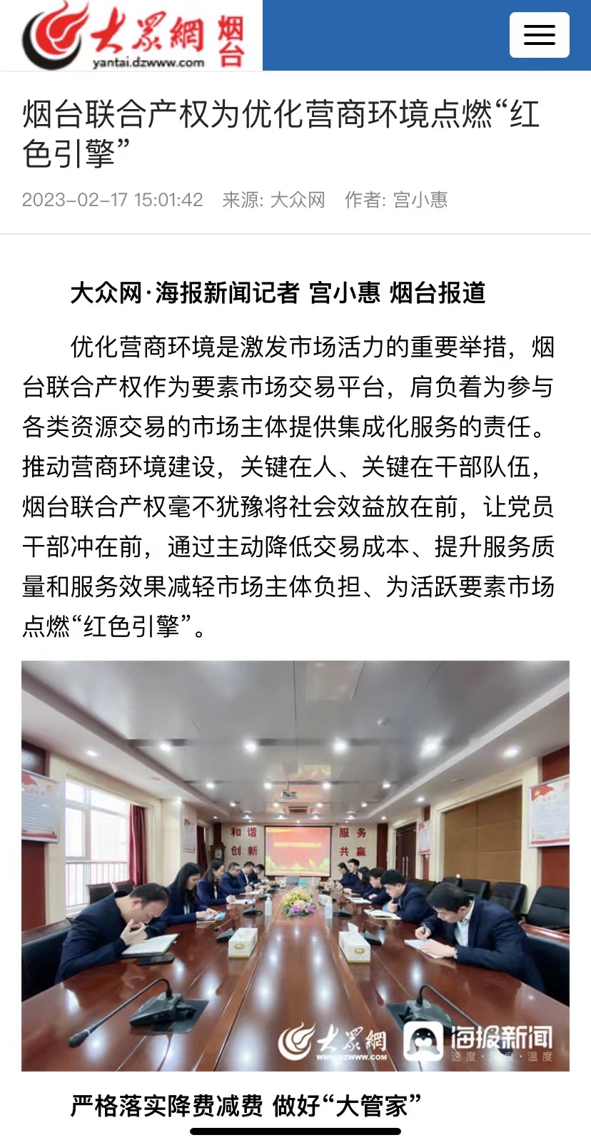 近日,“學(xué)習(xí)強國”煙臺平臺、煙臺日報社大小新聞網(wǎng)、大眾網(wǎng)煙臺刊發(fā)署名文章《煙臺聯(lián)合產(chǎn)權(quán)為優(yōu)化營商環(huán)境點燃“紅色引擎”當(dāng)好市場“店小二”》,全面介紹了2022年煙臺聯(lián)合產(chǎn)權(quán)作為要素市場交易平臺,肩負著為參與各類資源交易的市場主體提供集成化服務(wù)的責(zé)任,在推動營商環(huán)境建設(shè)方面,毫不猶豫將社會效益放在前,讓黨員干部沖在前,通過主動降低交易成本、提升服務(wù)質(zhì)量和服務(wù)效果減輕市場主體負擔(dān)、為活躍要素市場點燃“紅色引擎”。